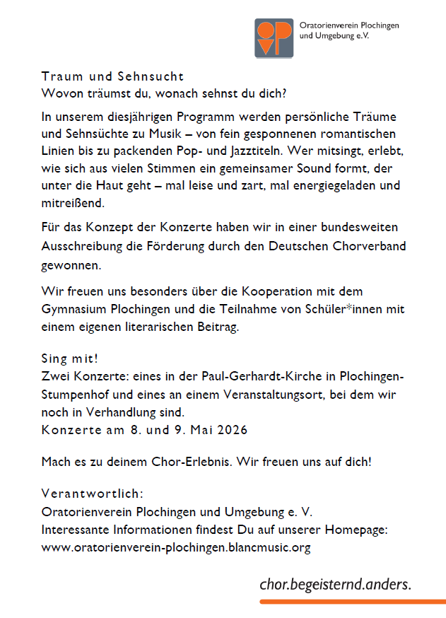 Wir wollen Sie - ganz nach Wunsch kurz oder ausführlich - über unseren Chor informieren, vorstellen wer wir sind, was wir in letzter Zeit gesungen haben, unser aktuelles Programm und geplante Projekte.